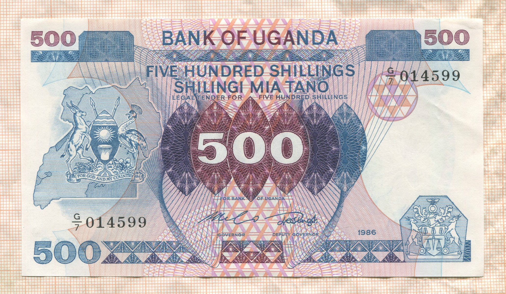 500 шиллингов. Уганда 1986г