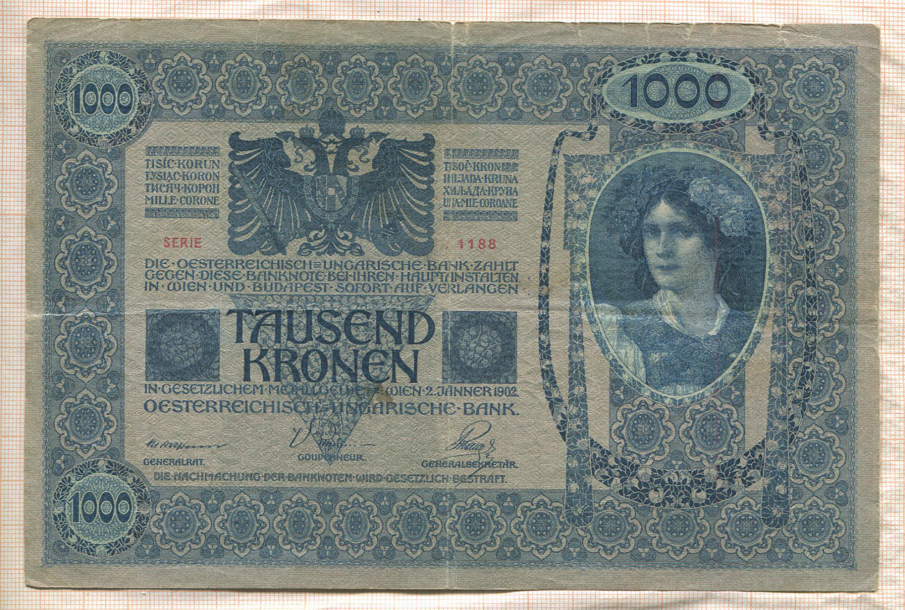 1000 крон. Королевство сербов, хорватов и словенцев. Штамп на банкноте Австро-Венгрии