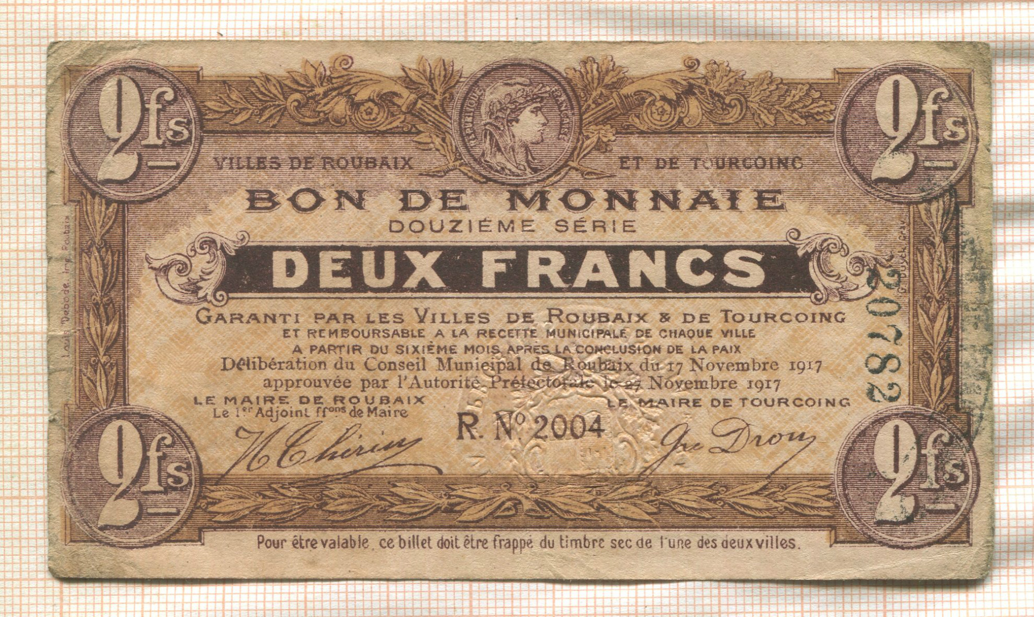 2 франка. Франция. Эмиссия городов Рубэ (Roubaix) и Туркуэн (Tourcoing)