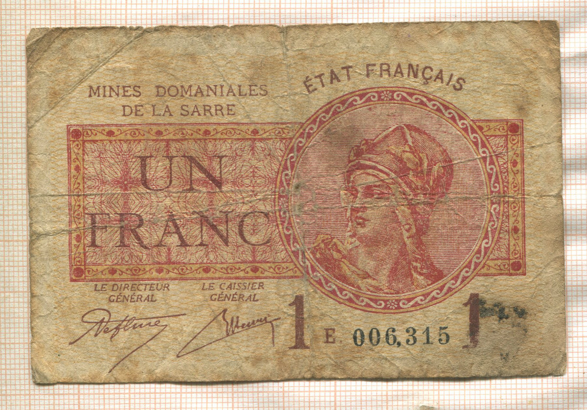 1 франк. Французский оккупационный выпуск в Сааре