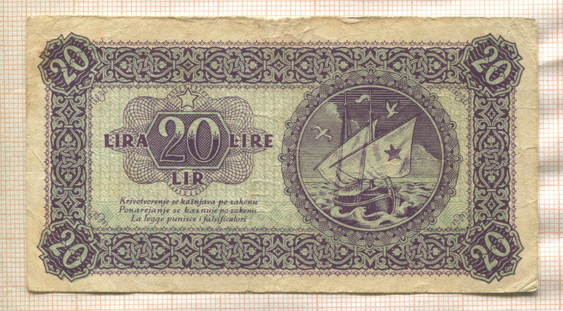 20 лир. Демократическая Федеративная Югославия. Полуостров Истра, Риека и побережье Словении