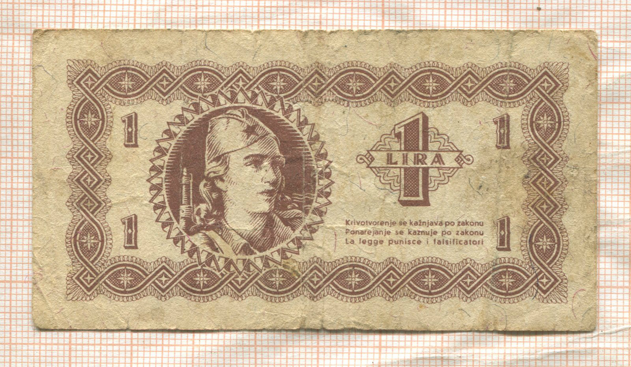 1 лира. Демократическая Федеративная Югославия. Полуостров Истра, Риека и побережье Словении